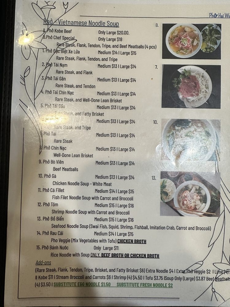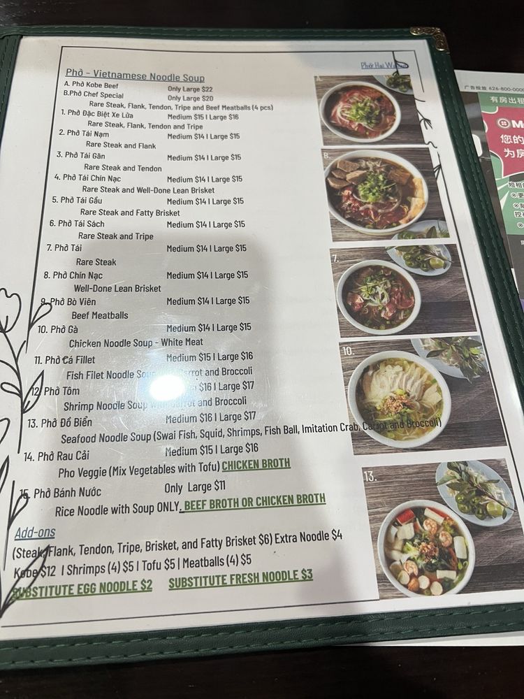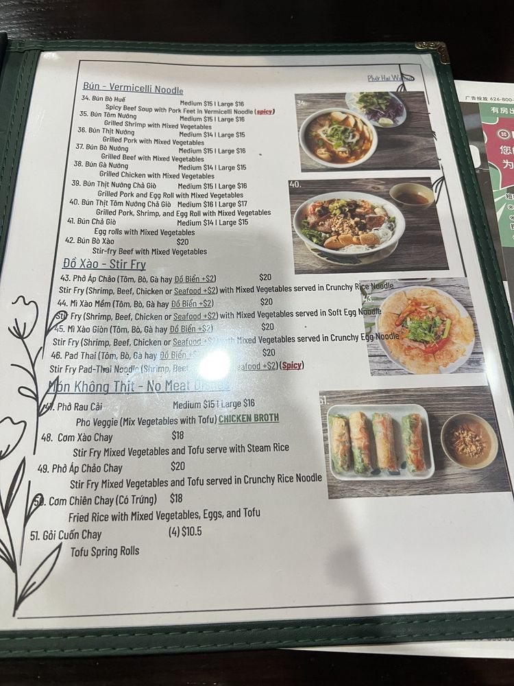 Pho Hai is a Vietnamese restaurant located in Walnut, CA, offering a range of traditional dishes such as Pho and Bnh M. Customers rave about the fresh and delicious ingredients, with menu options for meat lovers and vegetarians alike. The cozy and casual atmosphere makes it a great spot for lunch or dinner, with options for outdoor seating and private dining. From their flavorful Ph dishes like Ph Kobe Beef and Ph Chef Special to their crispy and savory Bnh M baguettes, there is something for everyone to enjoy. The reviews praise the quick and friendly service, highlighting the generous portions and tasty broth. Whether you're a fan of Vietnamese cuisine or looking to try something new, Pho Hai is a must-visit for a satisfying and authentic dining experience.