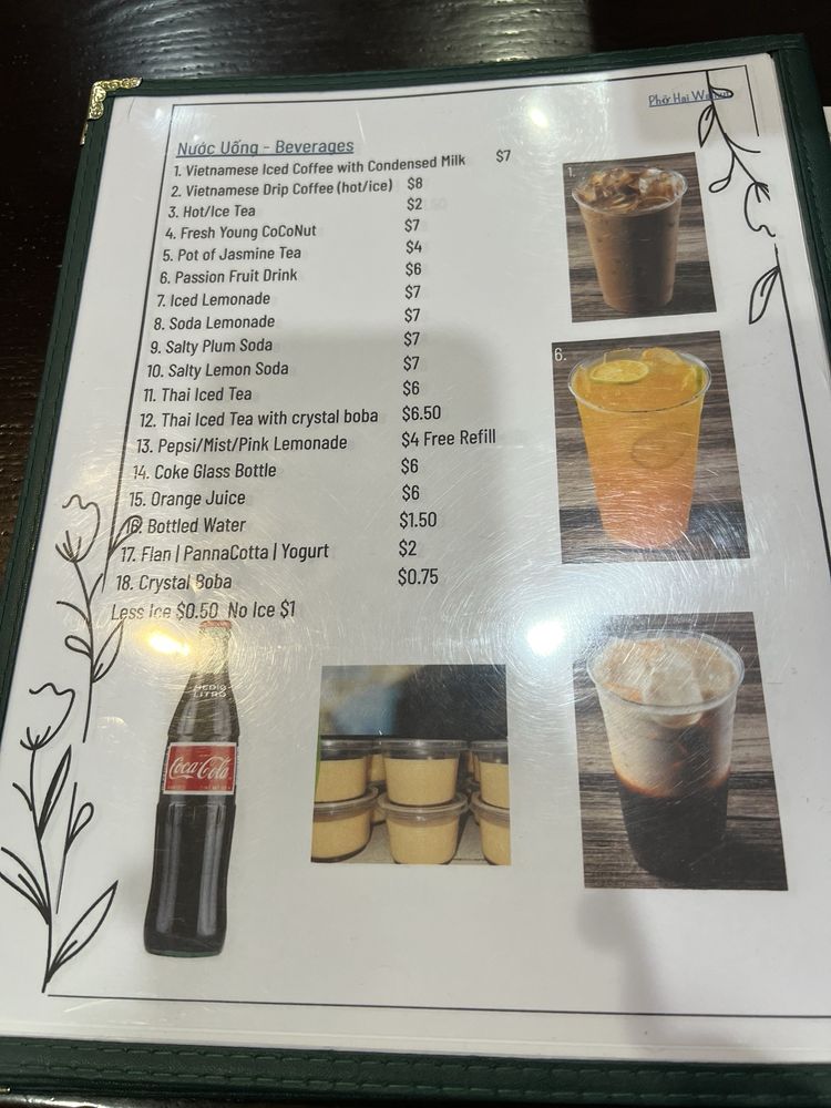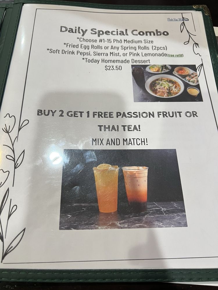 Buy any pho from #1 to #10 and 2 pieces egg rolls or 2 pieces spring rolls get free soda and free homemade dessert.